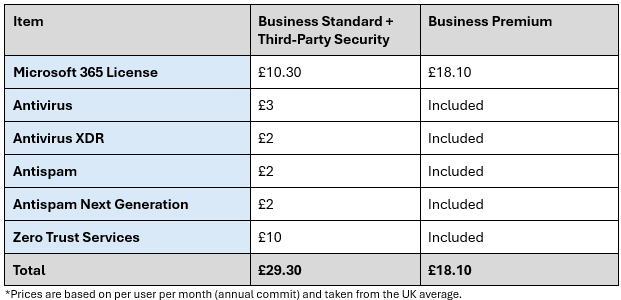 To highlight the potential cost savings, the following comparison table illustrates the cost difference between Business Standard with third-party security and Business Premium.